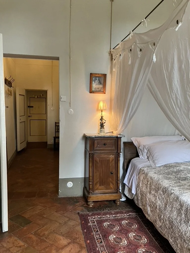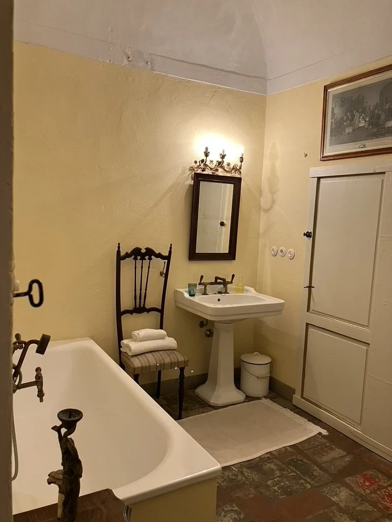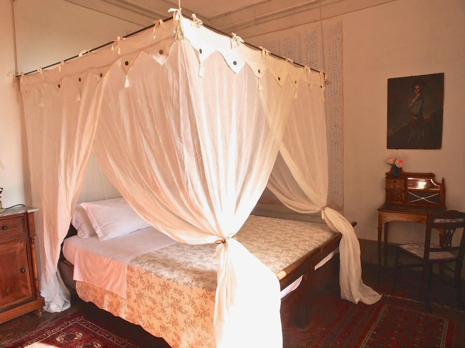A lovely double bedroom overlooking the dance floor with 19th century stencilled walls and an en suite bathroom with a bathtub.
